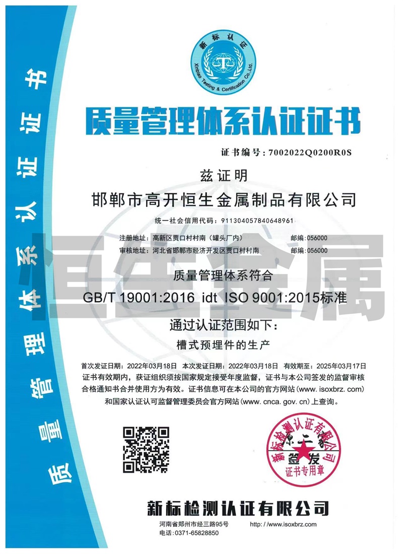 邯鄲市高開恒生金屬制品有限公司總部設(shè)在鋼城河北邯鄲,西鄰京廣線、東臨京深高速,地理位置優(yōu)越,交通比較便利。 我廠擁有多年生產(chǎn)預(yù)埋槽道的產(chǎn)品生產(chǎn)經(jīng)驗(yàn),專業(yè)生產(chǎn)鍍鋅防腐槽型預(yù)埋件系列產(chǎn)品,其中產(chǎn)品包括:高開恒生哈芬槽、哈芬槽鋼、預(yù)埋槽道、預(yù)埋滑槽、帶齒預(yù)埋槽鋼、槽式預(yù)埋件、工字鋼材料、C型槽材料配套的T型螺栓,也可根據(jù)客戶需求按圖訂做加工,產(chǎn)品廣泛應(yīng)用于隧道、城市軌道交通、地下綜合管廊、建筑幕墻施工工程。